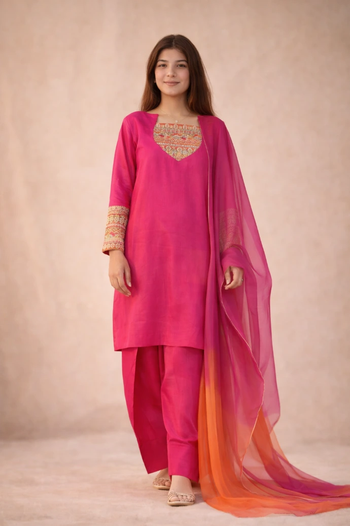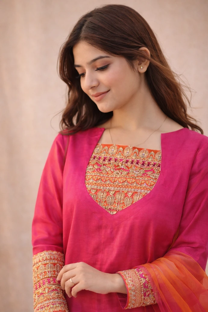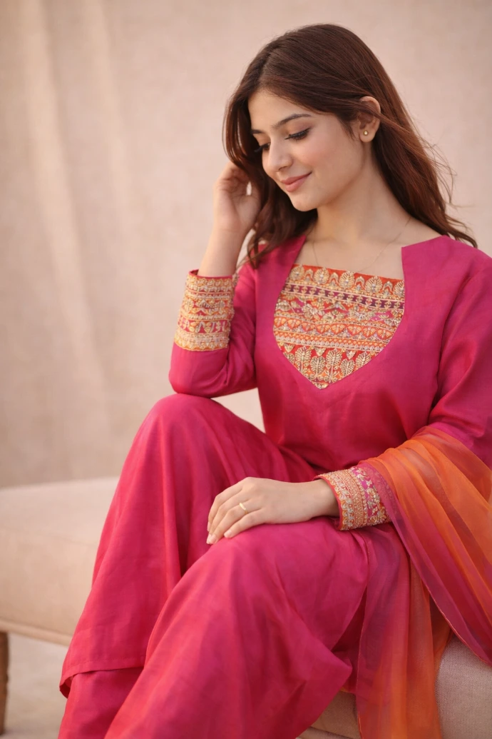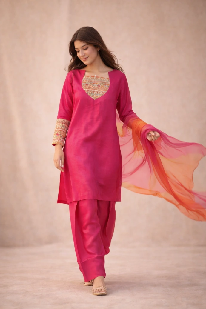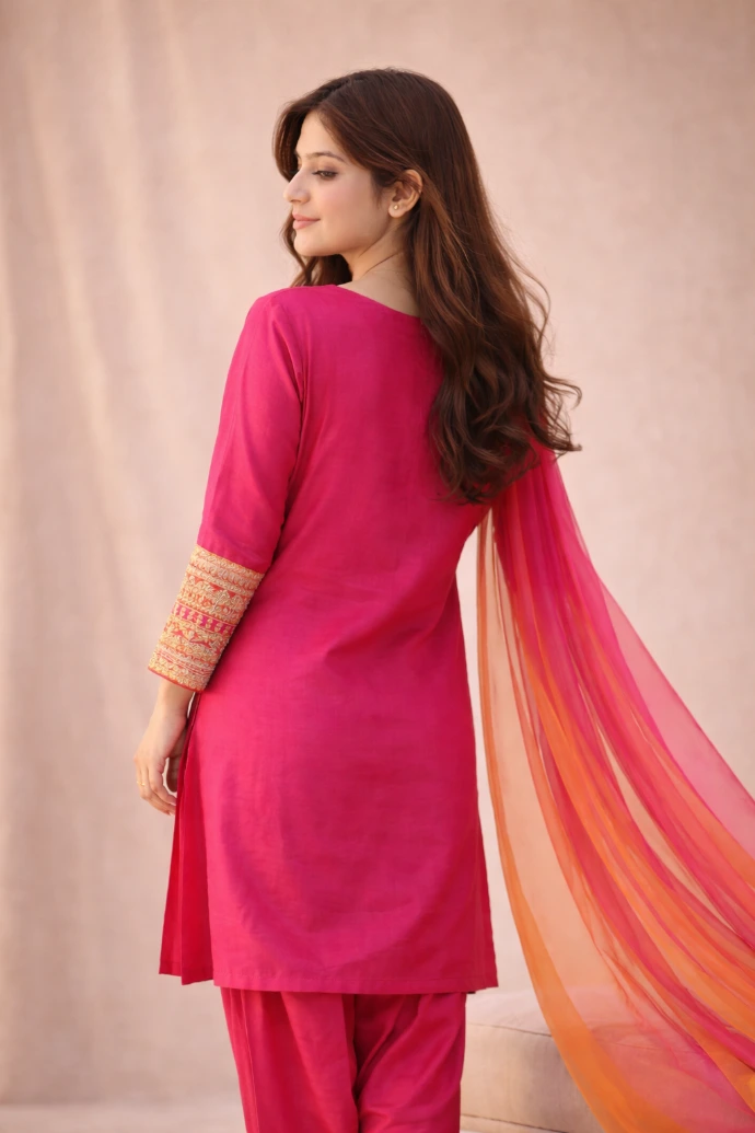 A refined expression of elegance, crafted in vivid magenta tones with intricate embroidery and graceful drape.